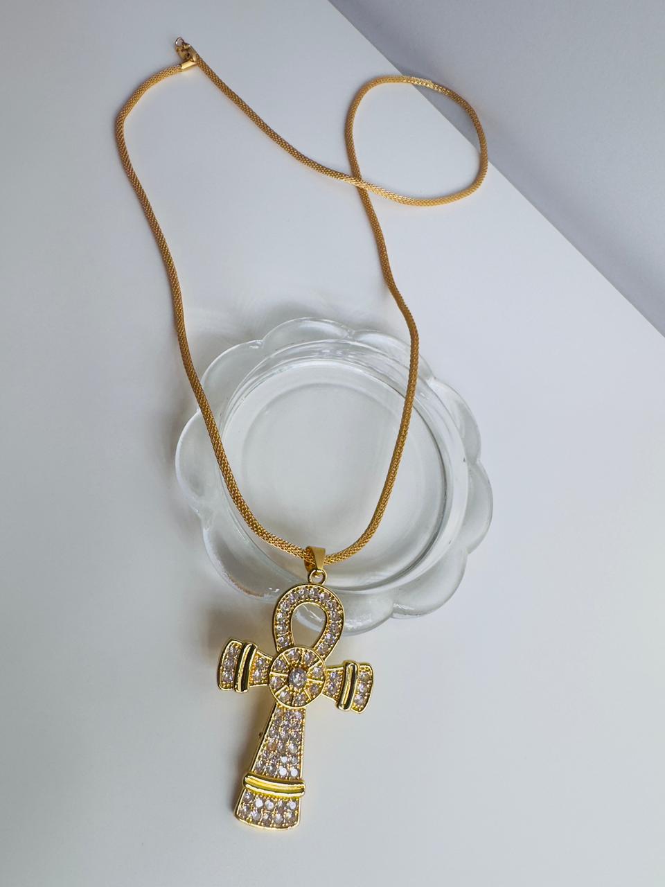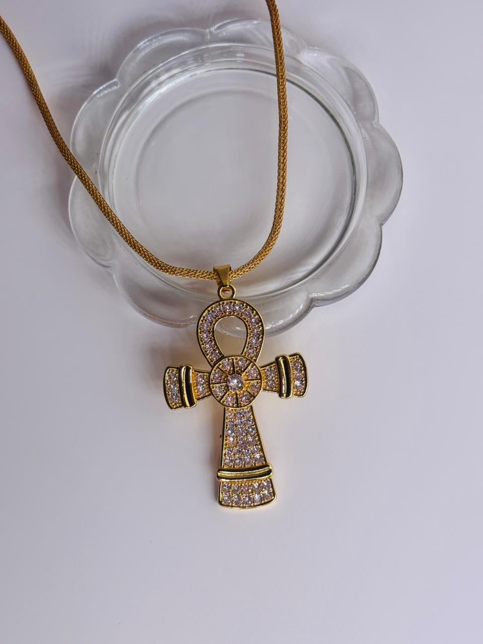 A refined gold plated chain necklace featuring an Ankh pendant embellished with sparkling stones. Elegant and symbolic, this piece adds a touch of luxury and meaning to any look.