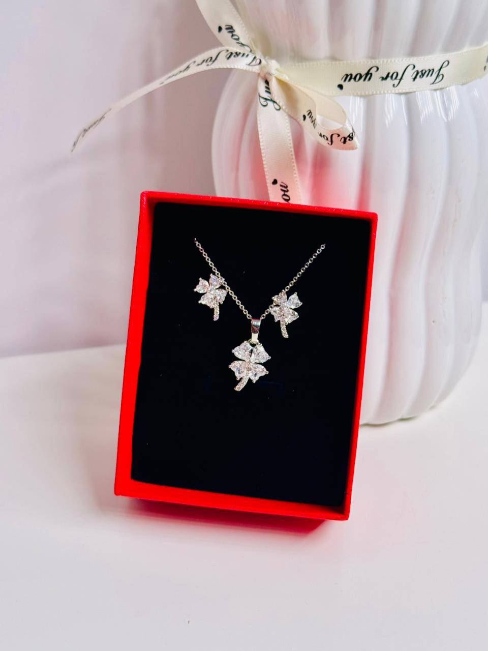 This stunning floral jewelry set features a delicate Silver-tone necklace paired with matching stud earrings, each adorned with sparkling crystal accents shaped like graceful flowers. this set makes a timeless gift or a charming addition to any jewelry collection.