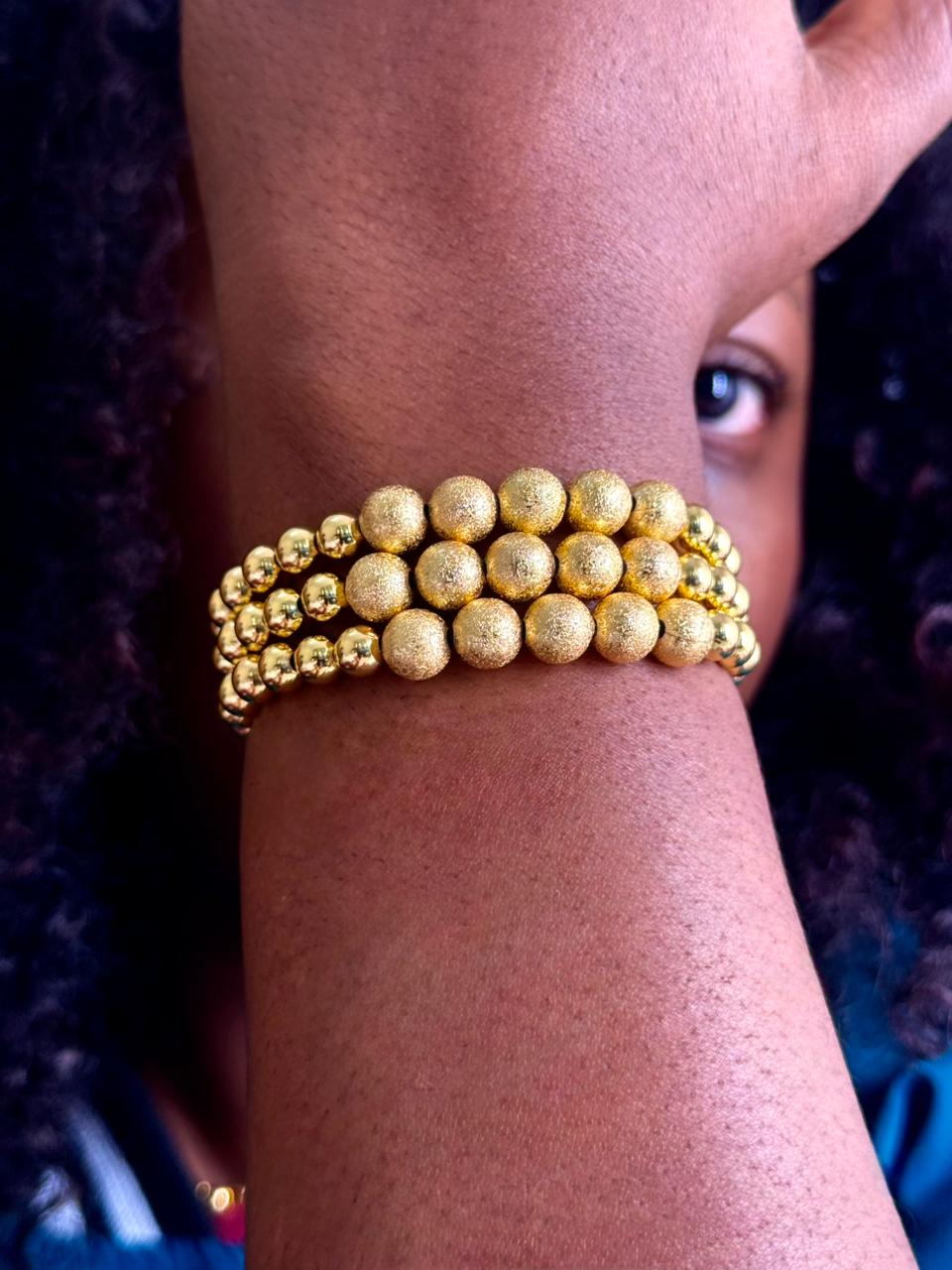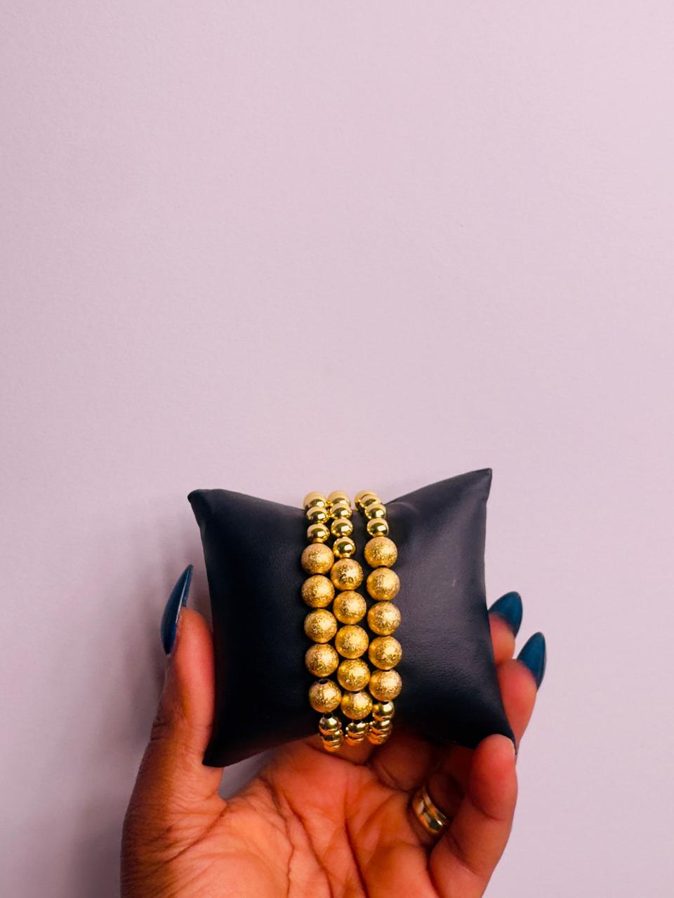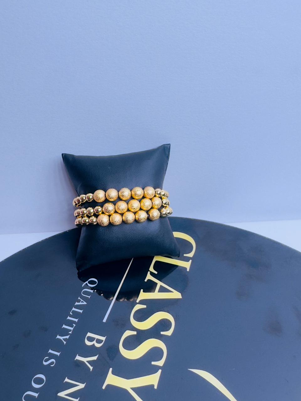 Elevate your style with this trendy gold beaded bracelet, designed with layered rows of smooth and textured beads for a bold yet chic look. The radiant gold finish adds instant glam, while the stretch fit makes it easy to wear all day. Perfect for stacking or wearing solo, this bracelet is a must-have accessory for effortless, modern style.