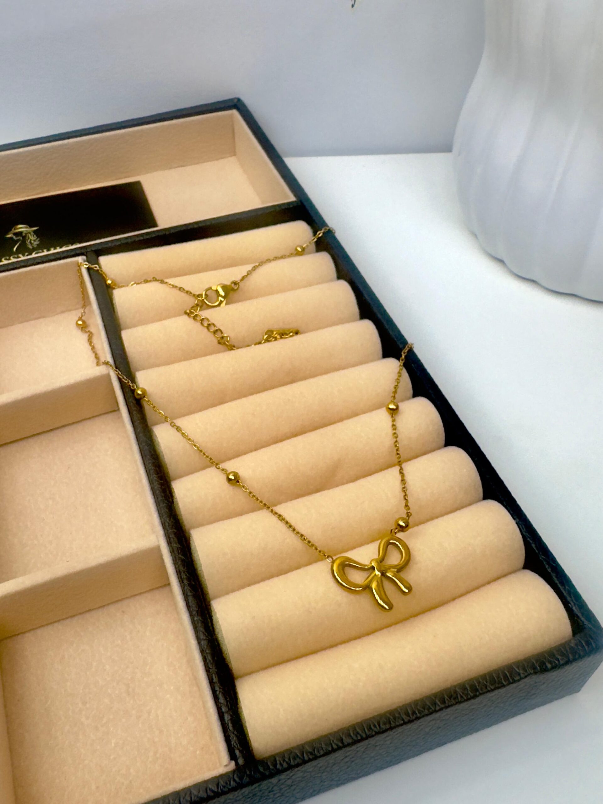 The stainless steel bow design adds a soft, feminine touch, making it perfect for those who love subtle yet stylish jewelry. Lightweight and refined, it’s ideal for everyday wear or layering with other necklaces for a graceful look.