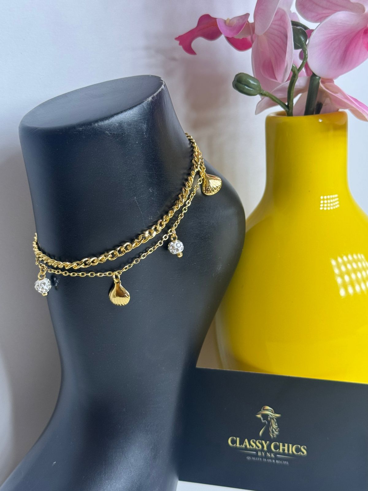 Anklet with layered chains adorned with elegant shell charms and sparkling bead accents. Feminine, stylish, and perfect for adding a subtle glow to your everyday or holiday looks.